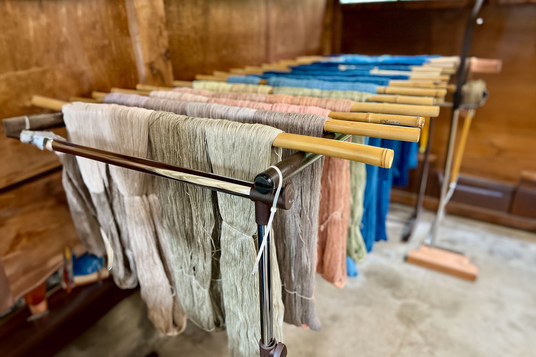 お酒とメッセージカードを結ぶのは、上越市浦川原の藍染加工屋「つばめのうた」の藍染紐です。職人さんが手作業で染めています。天然素材ならではの深い青色と柔らかな手触りが魅力的です。「つばめのうた」さんとはツバメのモチーフでご縁ができました。藍染という伝統文化を広める一助になれば幸いです。