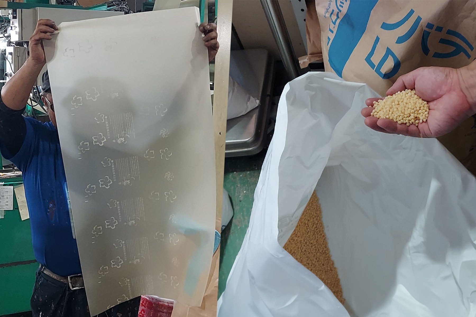 酒米の精米時には米ぬかが削ぎ落とされます。その米ぬかを再活用して手提げ袋を作りました。自然の温かみと独特の質感を持ち、製品を優しく包み込みます。米ぬかを有効活用した持続可能な包装材。この袋は、環境と資源を大切にする私たちの姿勢を象徴しています。